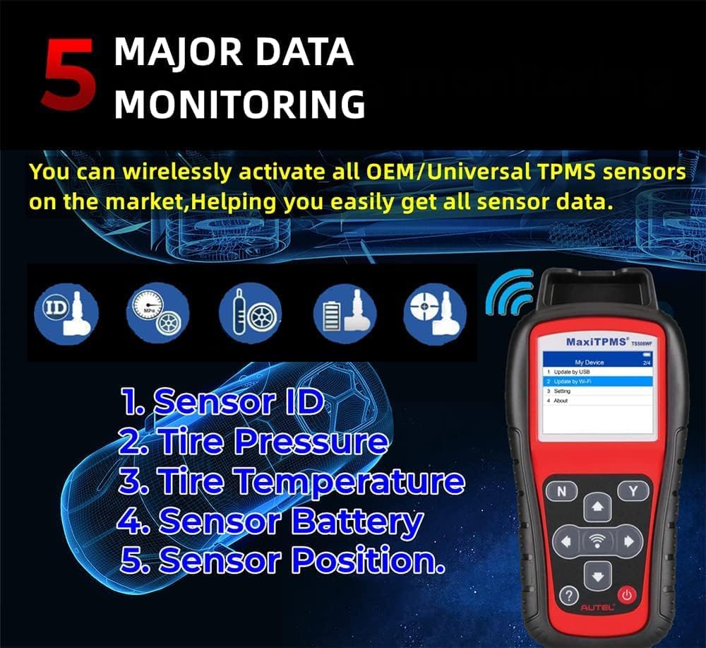 🚘【2023 Newest TPMS Tool, Upgrade of TS508, TS501, TS408, TS401】As 2023 newest, Autel TS508wf has packed almost all TPMS functions including one-step TPMS health check, read & clear TPMS codes, on-screen DTC description, reset TPMS warning light, activate/relearn both OE and aftermarket TPMS sensors, read sensor data, program Autel MX-sensors, and unique features like check key fob frequency, quick/advanced mode, Tire Type/ Pressure Selection for faster & better TPMS repairs & services.
